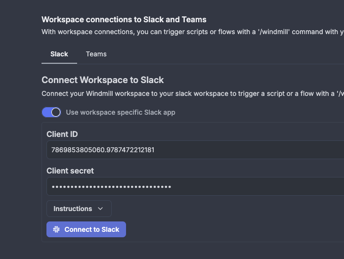 • Configure workspace-specific Slack app credentials (Client ID and Secret)